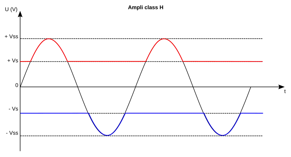 A Class H amplifier takes the idea of Class G one step further creating an infinitely variable supply rail. This is done by modulating the supply rails so that the rails are only a few volts larger than the output signal at any given time. The output stage operates at its maximum efficiency all the time. Switched mode power supplies can be used to create the tracking rails. Significant efficiency gains can be achieved but with the drawback of more complicated supply design and reduced THD performance.