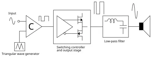 The input signal is converted to a sequence of pulses whose averaged value is directly proportional to the instantaneous amplitude of the signal. The frequency of the pulses is typically ten or more times the highest frequency of interest in the input signal. The output of such an amplifier contains unwanted spectral components (that is, the pulse frequency and its harmonics) which must be removed by a passive filter. The resulting filtered signal is then an amplified replica of the input.