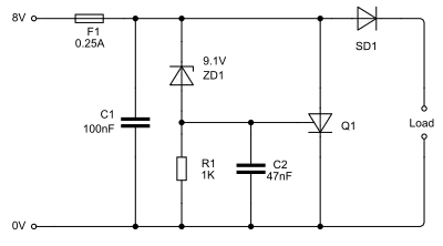 - Fuse F1 is the fuse that blows if the current drawn by the circuit significantly exceeds 250mA. This can be increased as needed, but make sure the thyristor Q1 has a higher current rating than the fuse. Also make sure the power supply can supply enough current to blow the fuse, as a current limited supply may fail to, and could overheat if the circuit is triggered.
