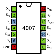 The 4007 integrated circuit contains three complementary enhancement-mode MOSFET pairs. One pair has connections to the drain terminals, one to the source terminals and the commoned drains (i.e. it is wired as an inverter) and one allows access to all source and drain connections. All pairs have the gate terminals commoned and available. The bulk connections are to the power rails (VDD for the p-channel devices and VSS for the n-channel devices).