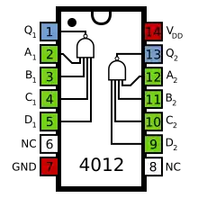 The 4012 is a member of the 4000 Series CMOS range, and contains two independent NAND gates, each with four inputs. The pinout diagram, given on the right, is the standard four-input CMOS logic gate IC layout: