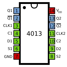 The 4013 contains two independent D-type flip-flops with asynchronous set/reset inputs. Whenever the set or reset pins go high, the appropriate output is expressed immediately on the outputs. When set and reset are low, the output shows the data at the input at the time of the last low-to-high clock transition. This is then held until the next transition.