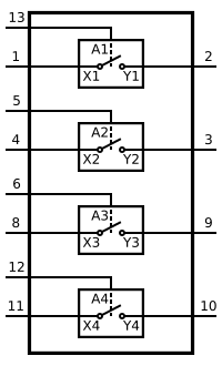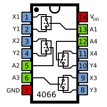 The 4066 contains 4 analogue bilateral switches, each with an active-high enable input (A) and two input/outputs (X and Y). When the enable input is set high, the X and Y terminals are connected by a low impedance; this is the on condition. When the enable is low, there is a high impedance path between X and Y, and the switch is off.