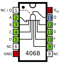 The 4068 is a member of the 4000 Series CMOS range, and contains a single 8-input NAND gate, and, on some models the inverted output (i.e. an AND gate). The pinout diagram, given on the right, is the standard eight-input CMOS logic gate IC layout: