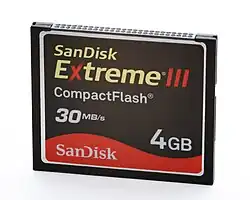 CompactFlash cards are a very common flash-based removable storage technology that was first released in 1994. It is heavily based on the PCMCIA standard. CompactFlash (CF) cards are larger than most other memory cards, but they are more rugged than most and have the advantage of a simple and open interface protocol, as opposed to devices like SD cards, which have proprietatry interfaces.
