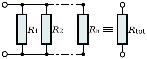 When resistors are wired in parallel, the reciprocal of the total resistance is the sum of the reciprocals of the individual resistances. For an explanation of this, see this proof. So for the resistor network to the right, the total resistance, Rtot, is: