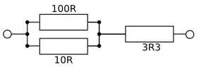 Resistors can also be combined in a combination of series and parallel. To calculate the total resistance in these cases, simply break it into smaller parts that are basic series/parallel combinations and treat each one as one resistor. Consider the arrangement to the right. This is made up of two resistors in parallel, in series with another resistor.