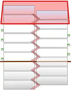 The following is a fun project that can be used as an introduction to music reading. Take a sheet of paper, the larger the better. Design a tall apartment house in cross section view. The house must be a split-level-building with 9 apartments on the left side, and 8 apartments on the right (17 half-levels overall). The 9 apartments on the left represent the spaces between the staff lines, while the 8 apartments to the right represent the staff lines themselves. Add a roof that marks the upper levels as attics, and brick walls or a horizontal base line that mark the lower levels as basements. If you want to, you can add balconies, window sills or other decorations to the apartments that represent the area of the actual staff lines.