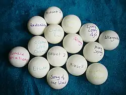 Purchase a pack of ping pong balls. You need as many balls as you have review pieces. Using a permanent marker, write the names of the review pieces one on every ball. Put the balls in a non-transparent bag (a pillow case does fine). For the practice, let the child randomly pull a ball out of the bag and play the piece.