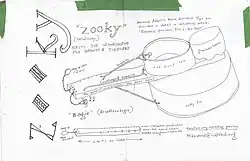 This idea was extended by means of certain previously overlooked materials at a Recycling Center not far from Madison, Wis., where someone attached a flat wooden bar to a cookie tin (on one side) and part of a plastic bottle and a cat food can (on the other side). The resulting fiddle-like contraption, to which further strings or coathanger wires can be added, is the Stradizuki (Zooky for short, or if it is more like a guitar, i.e. big with multiple pluckable plastic bottle bottoms attached, Stratozooky).