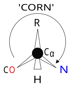 Each α-amino acid consists of a backbone part that is present in all the amino acid types, and a side chain that is unique to each type of residue. An exception from this rule is proline, where the hydrogen atom is replaced by a bond to the side chain. Because the carbon atom is bound to four different groups it is chiral, however only one of the isomers occur in biological proteins. Glycine however, is not chiral since its side chain is a hydrogen atom. A simple mnemonic for correct L-form is "CORN": when the Cα atom is viewed with the H in front, the residues read "CO-R-N" in a clockwise direction.
