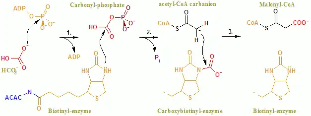 The overall reaction of ACAC(A,B) proceeds by a two-step mechanism.[27] The first reaction is carried out by BC and involves the ATP-dependent carboxylation of biotin with bicarbonate serving as the source of CO2. The carboxyl group is transferred from biotin to acetyl CoA to form malonyl CoA in the second reaction, which is catalyzed by CT.