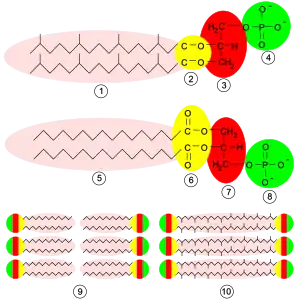 Membrane structures. Top, an archaeal phospholipid: 1, isoprene chains; 2, ether linkages; 3, L-glycerol moiety; 4, phosphate group. Middle, a bacterial or eukaryotic phospholipid: 5, fatty acid chains; 6, ester linkages; 7, D-glycerol moiety; 8, phosphate group. Bottom: 9, lipid bilayer of bacteria and eukaryotes; 10, lipid monolayer of some archaea.