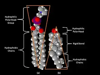 Cholesterol occurs naturally in eukaryote cell membranes where it is bio-synthesised from mevalonate via a squalene cyclisation of terpenoids. It associated preferentially with sphingolipids (see diagram) in cholesterol-rich lipid rafts areas of the membranes in eukaryotic cells.[12] Hopanoids serve a similar function in prokaryotes.
