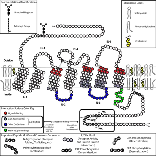 Structurally GPCRs are characterized by an extracellular N-terminus, followed by seven transmembrane (7-TM) α-helices (TM-1 to TM-7) connected by three intracellular (IL-1 to IL-3) and three extracellular loops (EL-1 to EL-3), and finally an intracellular C-terminus. The GPCR arranges itself into a tertiary structure resembling a barrel, with the seven transmembrane helices forming a cavity within the plasma membrane which serves a ligand-binding domain that is often covered by EL-2. Ligands may also bind elsewhere, however, as is the case for bulkier ligands (e.g., proteins or large peptides) which instead interact with the extracellular loops, or, as illustrated by the class C metabotropic glutamate receptors (mGluRs), the N-terminal tail. The class C GPCRs are distinguished by their large N-terminal tail, which also contains a ligand-binding domain. Upon glutamate-binding to an mGluR, the N-terminal tail undergoes a conformational change that leads to its interaction with the residues of the extracellular loops and TM domains. The eventual effect of all three types of agonist-induced activation is a change in the relative orientations of the TM helices (likened to a twisting motion) leading to a wider intracellular surface and “revelation” of residues of the intracellular helices and TM domains crucial to signal transduction function (i.e., G-protein coupling). Inverse agonists and antagonists may also bind to a number of different sites, but the eventual effect must be prevention of this TM helix reorientation. The structure of the N- and C-terminal tails of GPCRs may also serve important functions beyond ligand-binding. In particular, the C-terminus often contains serine (Ser) or threonine (Thr) residues that, when phosphorylated, increase the affinity of the intracellular surface for the binding of scaffolding proteins called β-arrestins (β-arr). Once bound, β-arrestins both sterically prevent G-protein coupling and may recruit other proteins leading to the creation of signaling complexes involved in extracellular-signal regulated kinase (ERK) pathway activation or receptor endocytosis (internalization). As the phosphorylation of these Ser and Thr residues often occurs as a result of GPCR activation, the β-arr-mediated G-protein-decoupling and internalization of GPCRs are important mechanisms of desensitization. A final common structural theme amongst GPCRs is palmitoylation of one or more sites of the C-terminal tail or the intracellular loops. Palmitoylation is the covalent modification of cysteine (Cys) residues via addition of hydrophobic acyl groups, and has the effect of targeting the receptor to cholesterol- and sphingolipid-rich microdomains of the plasma membrane called lipid rafts. As many of the downstream transducer and effector molecules of GPCRs (including those involved in negative feedback pathways) are also targeted to lipid rafts, this has the effect of facilitating rapid receptor signaling. GPCRs respond to extracellular signals mediated by a huge diversity of agonists, ranging from proteins to biogenic amines to protons, but all transduce this signal via a mechanism of G-protein coupling. This is made possible by virtue of a guanine-nucleotide exchange factor (GEF) domain primarily formed by a combination of IL-2 and IL-3 along with adjacent residues of the associated TM helices.