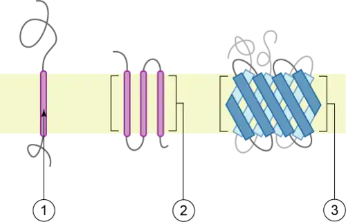 Span the membrane and have a hydrophilic cytosolic domain, which interacts with internal molecules, a hydrophobic membrane-spanning domain that anchors it within the cell membrane, and a hydrophilic extracellular domain that interacts with external molecules. The hydrophobic domain consists of one, multiple, or a combination of α-helices and β sheet protein motifs. | Ion channels, proton pumps, G protein-coupled receptor |