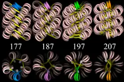 Robinson DJ, Fairall L, Huynh VA, Rhodes D. (2006). "EM measurements define the dimensions of the "30-mm" chromatin fiber: evidence for a compact, interdigitated structure". PNAS. 103 (17): 6506–11. doi:10.1073/pnas.0601212103. PMC 1436021. PMID 16617109.