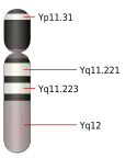 The Y-chromosome is one of the two sex-determining chromosomes in most mammals, including humans. In mammals, it contains the gene SRY, which triggers testis development if present. The human Y-chromosome is composed of about 60 million base pairs. DNA in the Y-chromosome is passed from father to son, and Y-DNA analysis may thus be used in genealogy research.