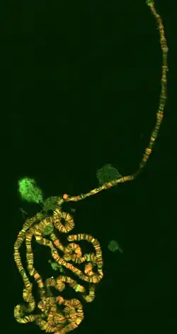 {{cite journal}}: Unknown parameter|month=ignored (help)CS1 maint: multiple names: authors list (link) - ↑ http://en.wikipedia.org/w/index.php?title=Lampbrush_chromosome&oldid=423150981