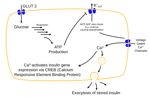 Mechanism of insulin release in normal pancreatic beta cells. Insulin production is more or less constant within the beta cells, irrespective of blood glucose levels. It is stored within vacuoles pending release, via exocytosis, which is primarily triggered by food, chiefly food containing absorbable glucose. The chief trigger is a rise in blood glucose levels after eating