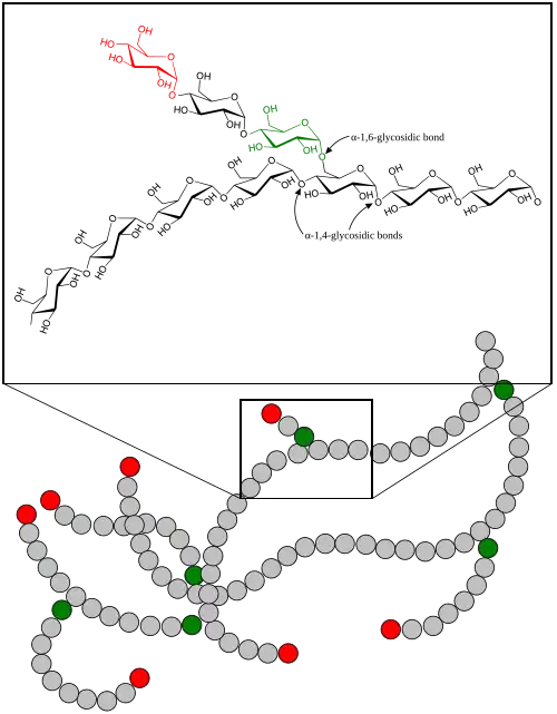Glycogen is the molecule that functions as the secondary long-term energy storage in animal and fungal cells. It is made primarily by the liver and the muscles, but can also be made by glycogenesis within the brain and stomach. Glycogen is the analogue of starch, a less branched glucose polymer in plants, and is commonly referred to as animal starch, having a similar structure to amylopectin. Glycogen is found in the form of granules in the cytosol in many cell types, and plays an important role in the glucose cycle. Glycogen forms an energy reserve that can be quickly mobilized to meet a sudden need for glucose, but one that is less compact than the energy reserves of triglycerides (lipids). In the liver hepatocytes, glycogen can compose up to 8% of the fresh weight (100–120 g in an adult) soon after a meal. Only the glycogen stored in the liver can be made accessible to other organs. In the muscles, glycogen is found in a low concentration (1% to 2% of the muscle mass). However, the amount of glycogen stored in the body - especially within the red blood cells, liver, and muscles - mostly depends on physical training, basal metabolic rate, and eating habits such as intermittent fasting. Small amounts of glycogen are found in the kidneys, and even smaller amounts in certain glial cells in the brain and white blood cells. The uterus also stores glycogen during pregnancy to nourish the embryo.[4]
