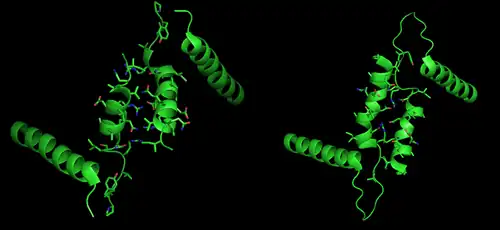 R and T States of Glycogen Phosphorylase b Tower Helices, on the left and right respectively. Note the relative positioning of the central tower helices, as well as the increased interactions between subunits in the R state. PDB3CEH, PDB3E3O