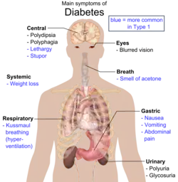 The classical symptoms of diabetes are polyuria (frequent urination), polydipsia (increased thirst) and polyphagia (increased hunger).[24] Symptoms may develop rapidly (weeks or months) in type 1 diabetes while in type 2 diabetes they usually develop much more slowly and may be subtle or absent.