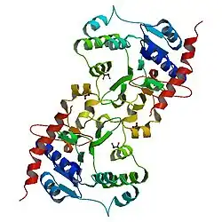 Glycogenin is an enzyme involved in converting glucose to glycogen. It acts as a primer, by polymerizing the first few glucose molecules, after which other enzymes take over. In humans, there are two isoforms of glycogenin — glycogenin-1, encoded by GYG1, and expressed in muscle; and glycogenin-2, encoded by GYG2,and expressed in the liver and cardiac muscle, but not skeletal muscle. Patients have been found with defective GYG1, resulting in muscle cells with the inability to store glycogen, and consequential weakness and heart disease. Glycogenin was discovered by Dr. William J. Whelan, a fellow of the Royal Society of London and current professor of Biochemistry at the University of Miami. It is a homodimer of 37-kDa subunits and is classified as a glycosyltransferase. The main enzyme involved in glycogen polymerisation, glycogen synthase, can only add to an existing chain of at least 4 glucose residues. Glycogenin acts as the primer, to which further glucose monomers may be added. It achieves this by catalyzing the addition of glucose to itself (autocatalysis) by first binding glucose from UDP-glucose to the hydroxyl group of Tyr-194. Seven more glucoses can be added, each derived from UDP-glucose, by glycogenin's glucosyltransferase activity. Once sufficient residues have been added, glycogen synthase takes over extending the chain. Glycogenin remains covalently attached to the reducing end of the glycogen molecule. Evidence accumulates that a priming protein may be a fundamental property of polysaccharide synthesis in general; the molecular details of mammalian glycogen biogenesis may serve as a useful model for other systems.[8]