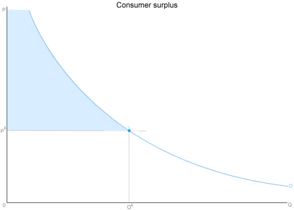 Consumer surplus is a measure of the benefit or welfare to the consumers of trading with a particular good. It can be defined as the amount of money that they save from making the transaction, or the amount that they are willing to pay to buy the good under discussion. Different consumers have different preferences (indifference curves) and thus obtain different levels of happiness with the trade. In graphs, they are always arranged so that the most happy consumer - the one willing to pay the highest price - is placed rightmost, while the least happy consumer - the one barely willing to make the trade - is placed leftmost (at the equilibrium point).