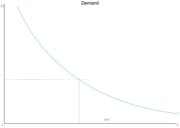 From the indifference curves we can see that people value things differently and alter what they demand (no pun intended) to best utilize their money. This naturally leads to the demand curve, which in many ways is similar to the sum of many individuals' indifference curves (but not entirely). The curve is often shaped similarly. The blue line in this graph is the basic demand curve. Note that the y axis is P, not Q2.
