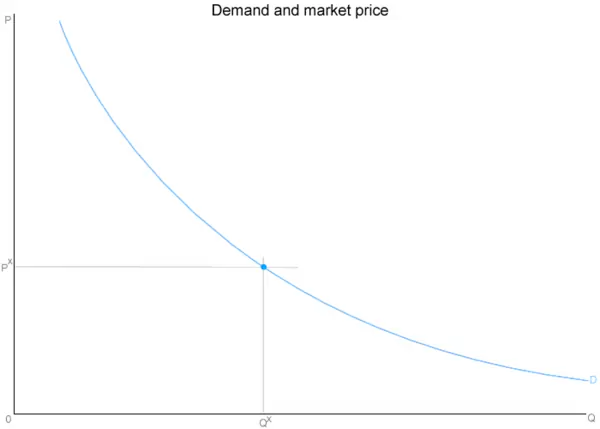 The quantity demanded is a specific quantity, given a demand curve and a price level. In this graph the price level of the market for the good, P*, has been extended to the y axis, price. At any quantity and given any demand curve, there should be only one natural equilibrium quantity demanded. This point is marked Q*. No trade occurs beyond this point.