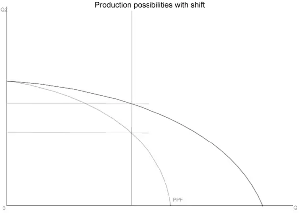 When a change in the economy causes more or less of a good to be produced when others are held constant, that is considered a shift in the one good's production possibility. The positive version shifts the frontier outward along the axis the good is placed at, so here an increase in good 1's production possibility stretches the PPF along the x axis. It is possible for that to actually increase production of good 2, depending on how society apportions its resources.