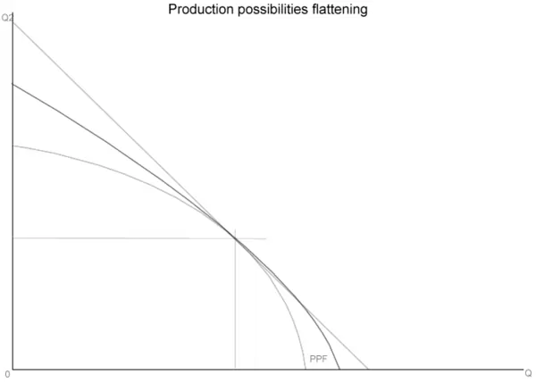 When a technological advance makes it relatively easier to exchange between two goods, a flattening of the PPF occurs as is demonstrated in the graph. When a firm takes a smaller percentage of industry market share, its PPF also flattens because its actions have a less significant effect on the total resource/good supply to the point that it has to exert fewer and fewer sacrifices of one good to obtain the next unit of the other good. It should also be easy to imagine situations when the opposite is true.