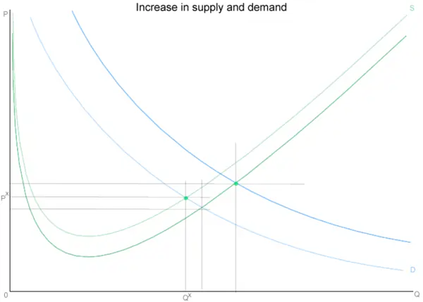 If both curves shift, their individual effects are added, although with slight alterations due to warping in the shape of the curves. If both curves increase, quantity increases for sure but price is indeterminate; if both curves decrease, quantity decreases for sure but price is indeterminate.