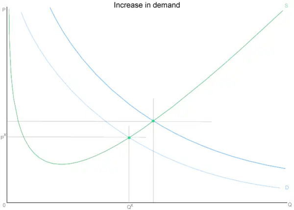If the demand curve increases (such as something being in fashion), the new equilibrium will have higher quantity and higher price; if it is lowered, the reverse happens.