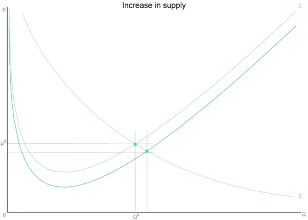 If the supply curve increases (such as an excise tax burden), the new equilibrium will have higher quantity and lower price; if it is lowered, the reverse happens.