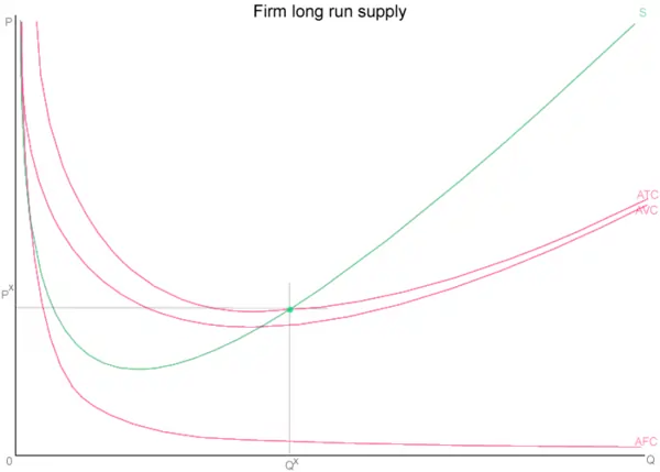 Long term, the firm produces at the point where marginal cost (and hence supply curve) intersects average total cost because at any higher point additional firms enter the industry and at any lower point the firm will earn negative profits (to be discussed later). This position is represented by the green point at Q*, equilibrium quantity. Extending this point to the y axis, we call this price P*, equilibrium price. The firm has to consider its fixed costs, which it satisfies at this level of output and price, along the green supply curve.