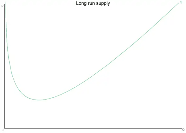 In perfect competition, all the firms are more or less equal, in which the combination of their individual supply curves results in another market supply curve identical to them except that it is a multiple as large (stretched). (However, we will continue to show it as the same size.) We can remove everything else about the firm to see just this green supply curve. The 'common' component of the supply curve that textbooks often discuss is the positive-slope half, but we cannot ignore the first component.