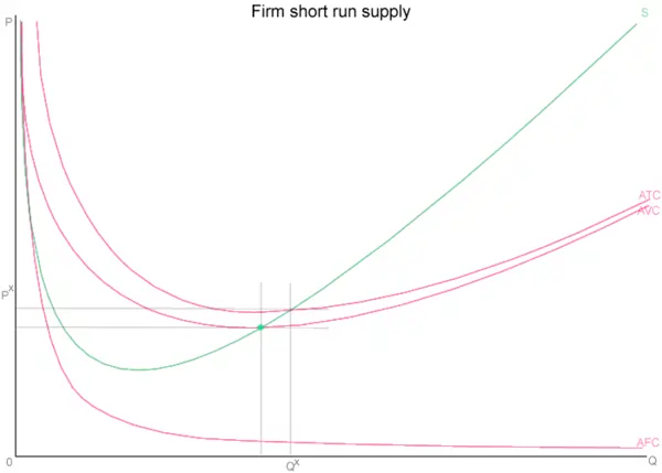 The minimum position at which the firm will produce instead of shutting down is shown by this alternative green point along its marginal cost / supply curve, where it intersects average variable cost. If a firm cannot sell for as much as what it costs to produce that additional unit (ignoring the fixed cost, which is unavoidable in the short run), and the units before that are unproductive as well, then the firm will close down and choose to suffer the fixed cost and not incur additional expenses from operating.