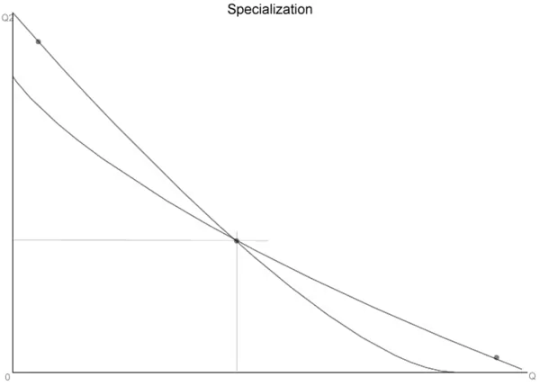 These different entities can then take actions to specialize in one field. Specialization causes the PPF to take the concave outward form as the graph shows, because choosing to produce more of one good allows one to produce far more combined goods.