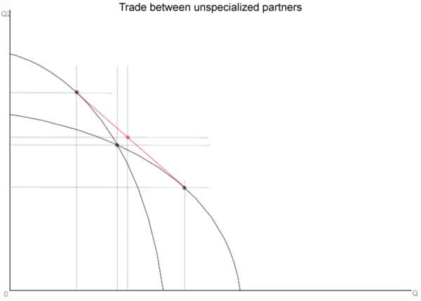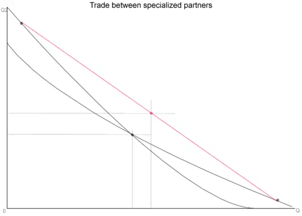 Trade between these two entities can be done after they each produce at their optimal (depending on where society wants to allot its resources) and then exchanging goods at a fair ratio. The result of fair exchange is the pink line connecting them. The result is a higher possibility for each society through trade than each can reach without, as shown by the comparison between the center gray point and the pink point.
