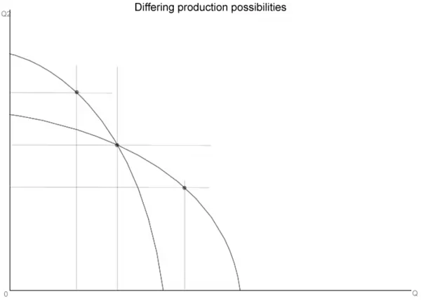 Different entities will have different possibility curves, which allow for trade to be done. In this case, each society might decide to produce at these two indicated positions because their output is relatively higher for those positions. However, should they choose to have the same output position, that position will be significantly lower than their optimal positions. This is the case for entities that do not trade.
