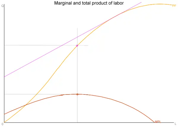 The point where the highest isoprofit line overlaps with the production frontier is where the firm will produce. Any higher isoprofit line is unattainable and any lower isoprofit line will generate less than optimal profits. The result is that more workers are hired than the one that helps increase profit the most (has the highest marginal product of labor, MPL). The slope of the isoprofit line determines where this position actually is. The right brown point is the position of the firm's labor hired.