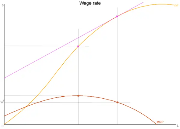 In perfect competition, firms can only afford to hire workers at the same amount of profit they can generate for the firm. Extending the right brown point (position at which hiring stops) gives the wage rate. Supposedly, all firms in the industry are equally productive and thus reach this same point, which brings about labor equilibrium. First, we must multiply the graph, which is in terms of units production in the y axis, to currency (P). This changes the marginal product of labor MPL into marginal revenue product MRP (or marginal revenue of labor MRL). The MRL definition is clearest because in perfect competition it makes clear sense for a firm to hire workers - marginal cost of labor - at the same amount as the marginal revenue of labor.