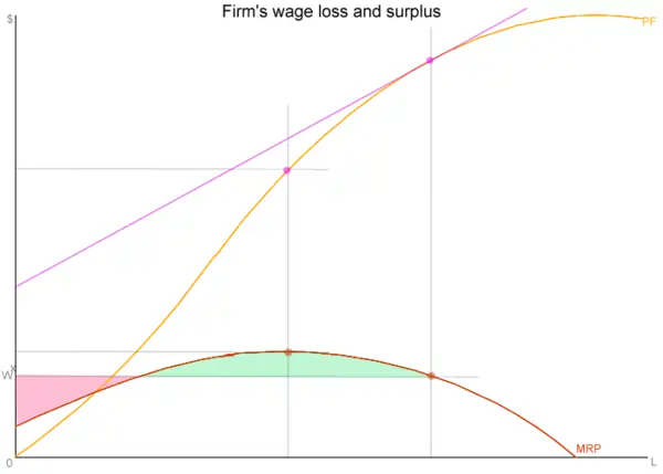 A firm's loss and profit can also be shown through the MPL. Since MRP reflects earnings and the wage rate W* reflects expenses, the firm's surplus is the green area in the graph - the area under the MRP but above W*. The firm's losses is the red area in the graph - the area under W* but above MRP. Since the firm stops hiring at the far right corner of the surplus area, there is no additional loss pass that point. In perfect competition the two areas (loss and surplus) cancel each other out, but with the green area exactly fixed cost larger than the red area.