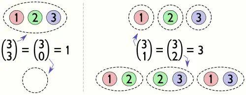 - ↑ Notice that we cannot regard the situation as placing three indistinguishable balls (representing three groups) into four distinguishable cells (representing four people) with capacity one (since every person can only assigned to one group). Since with this consideration, it is impossible to assign a group to every person (we can only assign groups to three people). Also, with such consideration, one ball can only be put in one cell, which implies one group can only contain one person, but this is not the case.