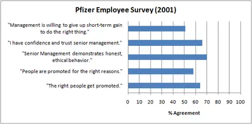 After being demoted by Pfizer in 2003, Rost decided to launch a personal attack on the company. He compiled data, specifically highlighting areas with which employees did not agree. The graphic to the right displays these percentages.