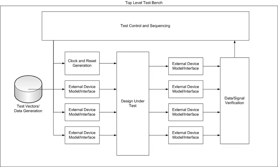 In this design, the “testbench” itself is merely a module without any external interfaces that instantiates the many modules that make up the modules that do the actual testing. The wrapper testbench and all the testing modules that make up the test bench (everything except the design to be tested) are often collectively referred to as a testbench. Often instantiated in a test bench wrapper is the design to be tested, external interface models, test data generators, signal verification modules, and a control module that controls the external interface modules and reports information to the user.
