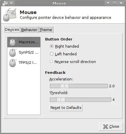 To alter the settings of your mouse, go to the pure:dyne menu (by right clicking on the desktop) and go to Settings and select Mouse. In this application you can change the behavior of your mouse.