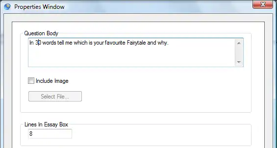 In this question type you can ask the quiz taker to write a short Essay. The subject of the essay is described in the Question Body box and you can limit the height of the text box entering the number of lines. Essay questions are not automatically scored and so the feedback for these questions is limited to a single piece of text, written in advance. You can switch this feedback off by unticking Display Feedback Page for Essay Questions in Quiz Options - Other Labels.